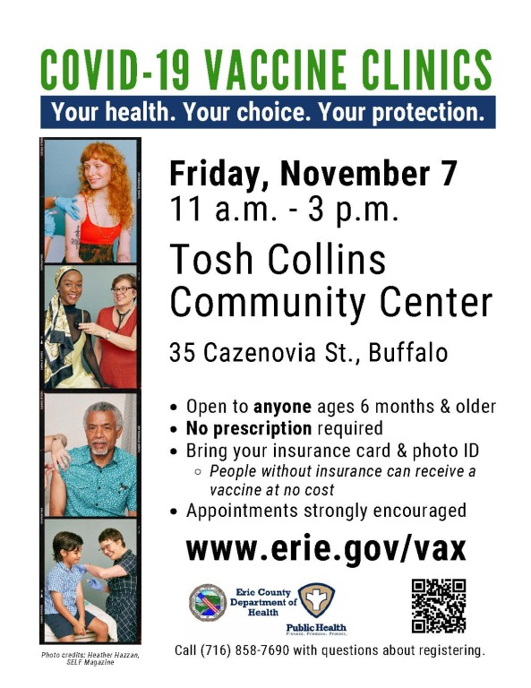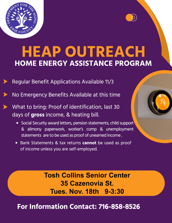 - Lunch- Monday Nov 3, 2025 11:30 AM to 12:30 PM - The Tosh Collins Center is host to the Erie County Stay Fit Dining Program. A hot lunch will be served from 11:30 AM to 12:30 PM, with a suggest donation of $3 for seniors over 60 and $5 for everyone else. Reservations must be 24 hours in advance by call Kelly at 822-4532 x103 or email kelly@southbuffalo.org