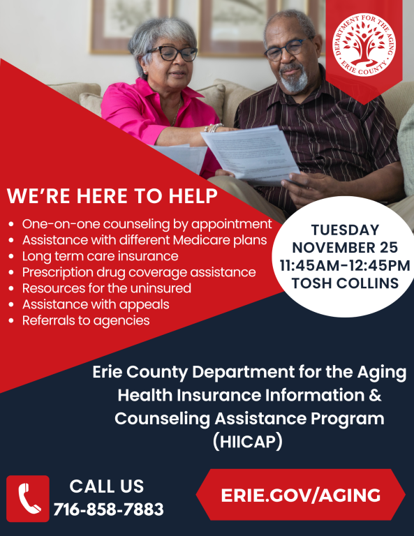 - Lunch- Friday Nov 21, 2025 11:30 AM to 12:30 PM - Lunch & Learn- Friday Nov 21, 2025 11:45 AM to 12:30 PM - Erie County’s Department of Aging’s University Express returns for the Fall Semester. Join us on Fridays from 11:45 am to 12:30 pm for these informative and entertaining classes. Make sure to order lunch when you register for the class at the front desk.